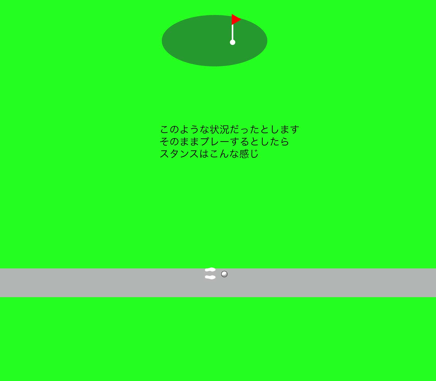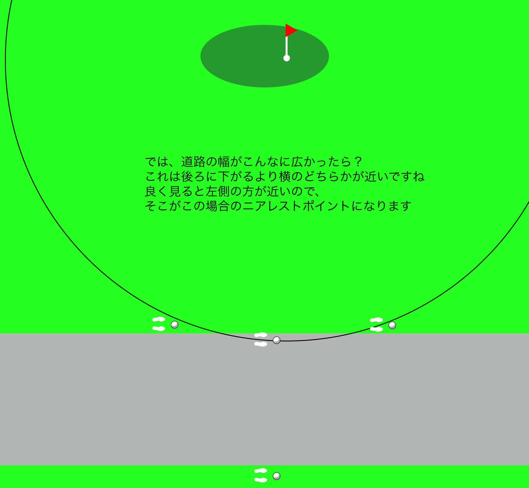 カート道の幅を考えると、実際問題としては真横に横切っている場合、ほとんどの場合がニアレストポイントは後方になると思われます。ニアレストポイントが後方の場合、周囲にバンカーやペナルティエリアがなければ、救済エリアはほぼ半円になります。ニアレストポイントが横になる場合、イラストの円弧の外側で、かつスタンスがカート道にかからない1クラブレングスの範囲が救済エリアとなります。2021.06.10回答 Mr.golfbaka