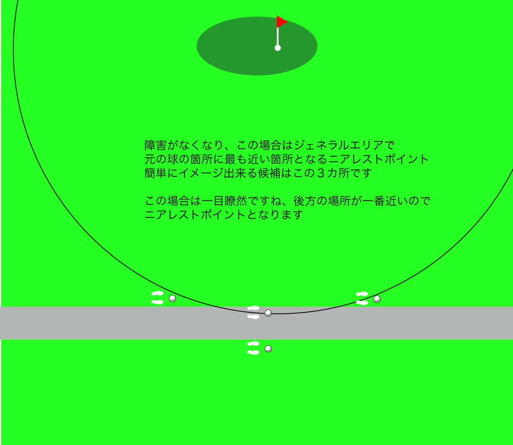 ニアレストポイントは、元の球の場所よりホールに近づかず障害がなくなる場所で、元の球と同じコースエリアで、元の場所に最も近い場所となります。そして、そこからホールに近づかず障害もない同じコースエリアの1クラブレングス以内の場所が救済エリアとなります。イラスト作ったので見てみましょう。